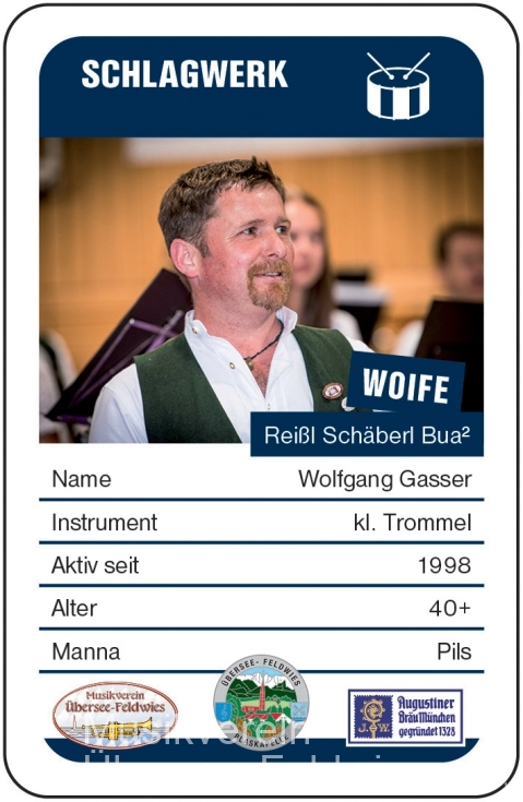 Auweh, der Reißl Schäberl Bua - Wolfgang Gasser. An kleinem, großem, rundem und eckigem Schäberl ist der Woife seit vielen Jahren im Schlagzeugsatz am Trommeln . Oftmals sieht man ihn bei Standkonzerten auf Dächern rumturnen, um Sonnenuntergänge zu fotografieren - kein Problem, dann bleibt für die anderen Schäberlbuam mehr zu tun. Als Reißl-Bua besteht eine nicht näher erläuterte Verwandtschaft zum Steiff-Reißl-Bua Maschd. Ein schnelles Pils als Manna geht immer: "Woasst, es pressiert, sunst geht die Sunn ohne mi unter"