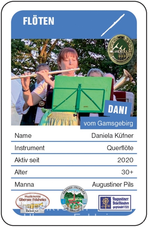 Die Dani vom Gamsgebirg - die Schlechingerin Daniela Küfner unterstützt den Verein seit 2 Jahren als hochqualifizierte Querflötenausbilderin, als Leiterin des Schülerorchesters und seit 2021 als Beisitzerin in der Vorstandschaft. In der Blaskapelle ist sie seit Kurzem im Flötensatz unverzichtbar. Manna ist das gaumenfreundliche Augustiner Pils.