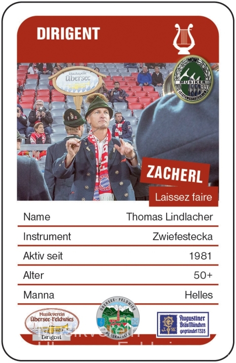 Der "Über-Joker" im Musikantenquartett der Blaskapelle Übersee-Feldwies- ohne ihn geht nichts in der Kapelle: Der Zacherl, Thomas Lindlacher - Dirigent und inaktiver Baritonist. Ein richtiges Eigengewächs am "Zwiefestecka". Sein Manna ist auch das Blaskapellen-Standard-Getränk: das grüne Augustiner!