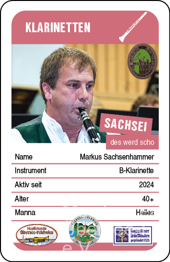 Der Sachsei, Markus Sachsenhammer, war früher schon beim Verein musikalisch tätig. Auch er hat, vielleicht auch motiviert durch seine beiden musizierenden Töchter, als Wiedereinsteiger den Weg über Erwachsenenbläserklasse, Jugendkapelle und "Auslandssemester", in die große Musi gefunden. Das in der Jugend versäumte Leistungsabzeichen hat er nachgeholt und steht dem Verein, nicht nur an der Klarinette, engagiert zur Verfügung.